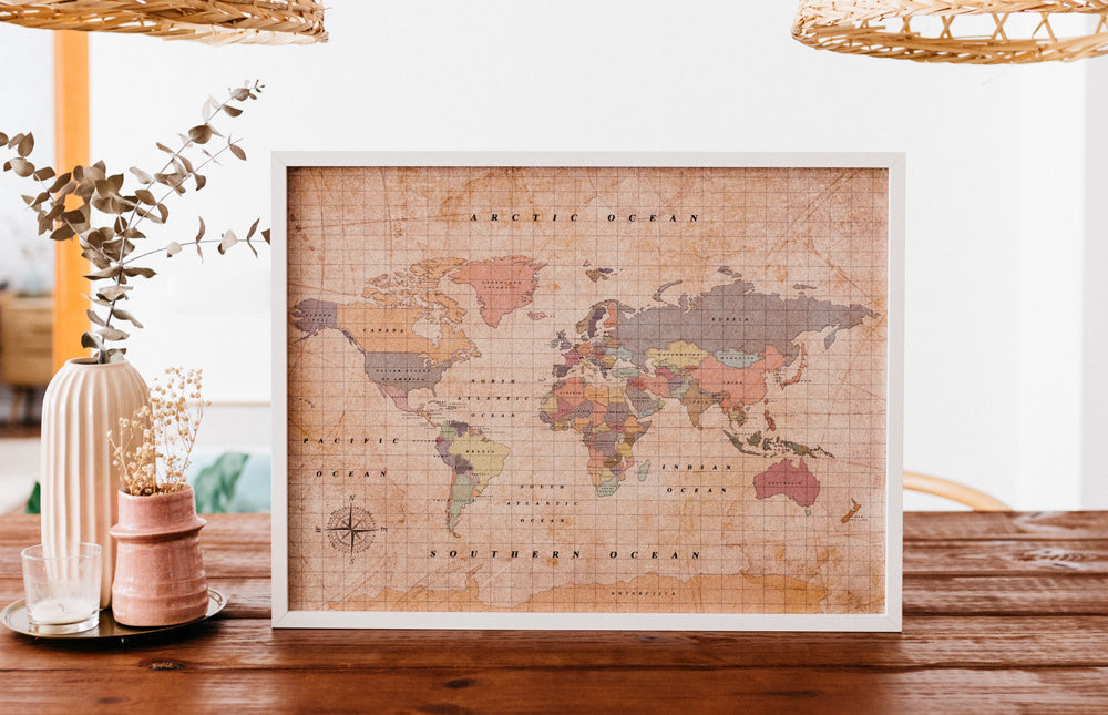 Es ist sehr aufregend, zu essen und dabei die Welt zu beobachten oder Anekdoten von seinen Reisen am Esstisch im Kreise der Familie und Freunde zu erzählen. Eine Weltkarte, die an der Wand vor dem Gästetisch hängt, ist die ideale Dekoration.