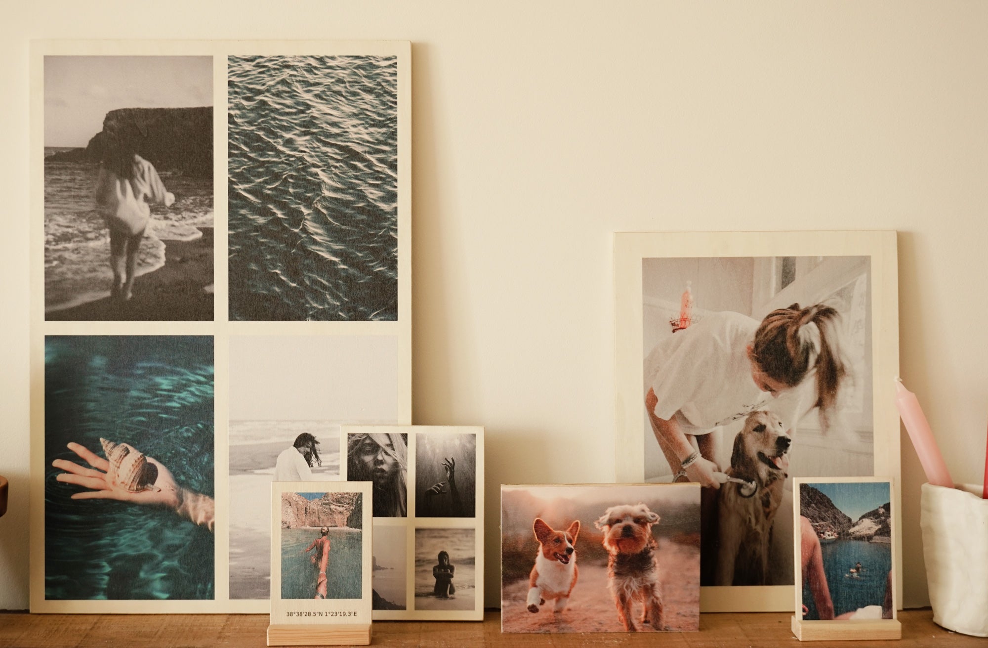 Wählen Sie Ihre Lieblingsfotos aus und drucken Sie sie auf Holz, um eine originelle Komposition zu schaffen.