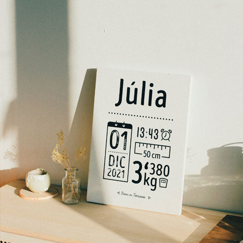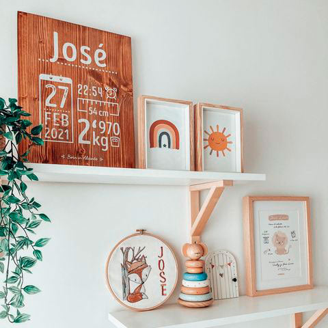 Ein Bild für das Kinderzimmer, von hoher Qualität und personalisiert mit den Geburtsdaten des Kindes. Ein Andenken an den besonderen Tag, das ihr Zimmer mit einem natürlichen und handgefertigten Touch schmücken wird. Eine perfekte Geschenkidee für eine Taufe.