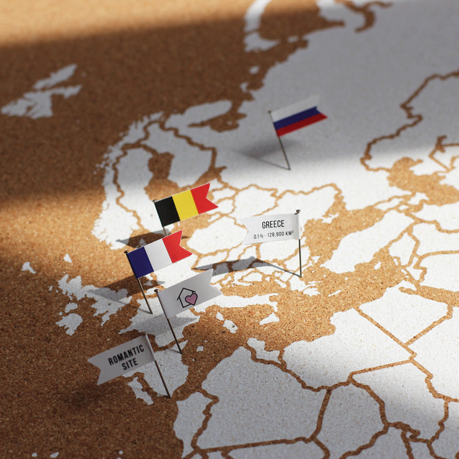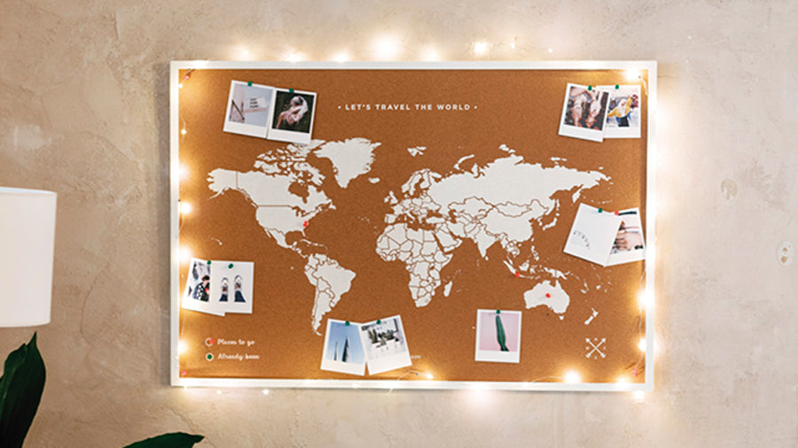 Eine Weltkarte aus Kork ist eine sehr originelle Idee, um die Erinnerungen an deine Reisen festzuhalten und von den nächsten zu träumen. Von allen Karten, die es auf dem Markt gibt, ist die Karte aus Kork zweifellos diejenige, die sich am besten persönlich gestalten lässt. Mit diesem Material kannst du Pins, Fotos, Flaggen, Tickets, usw. aufhängen. Alles, was du möchtest!