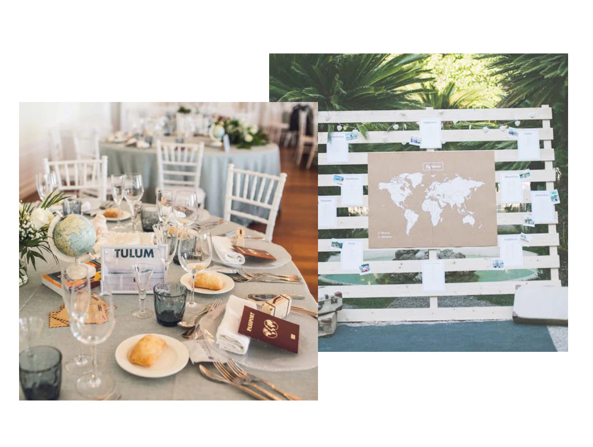 A theme wedding where the bride and groom share their love of travelling. The fil rouge of the wedding is travel. Suitcases, destinations… every detail tells a story and has a sense and a meaning.