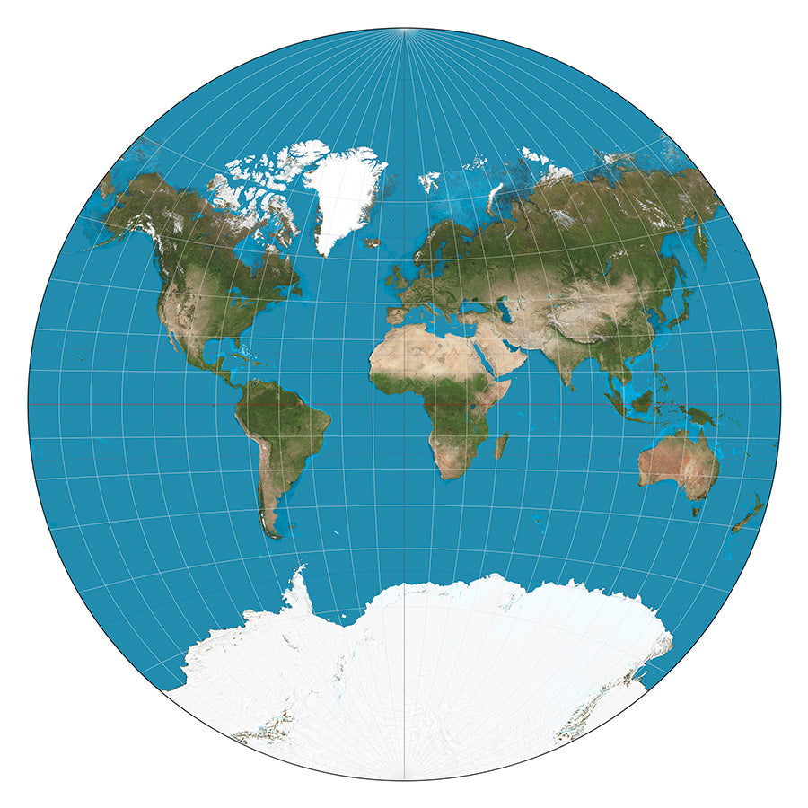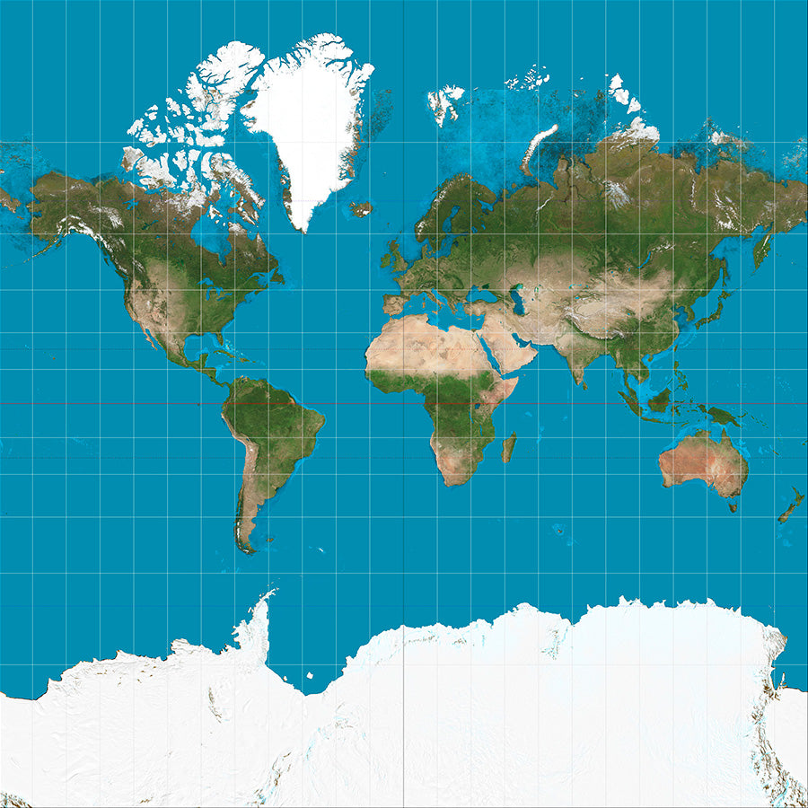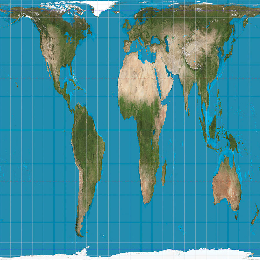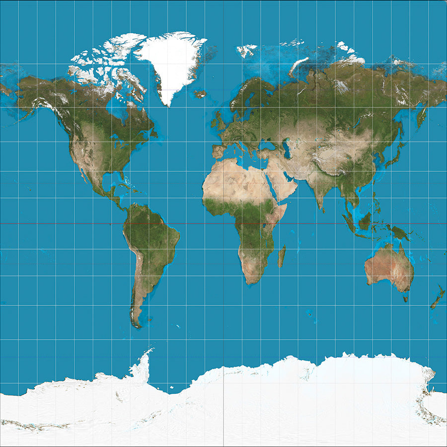 The best known and most widely used cartographic projection of the Earth to this day; its advantage is that it graphically shows the distribution of the countries of the world.