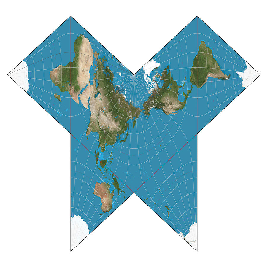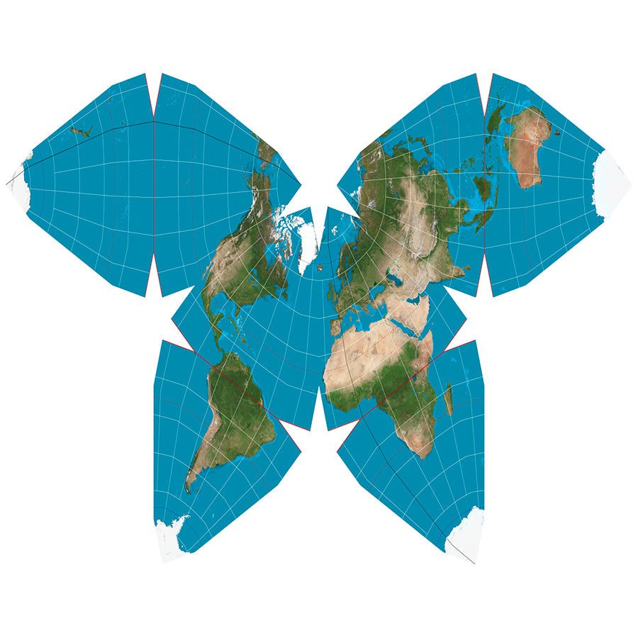 It tries to show a more realistic world map reflected in the figure of a rubber ball that is flattened and shown in the shape of a butterfly, with geometric measures that allow it to return to its original shape.