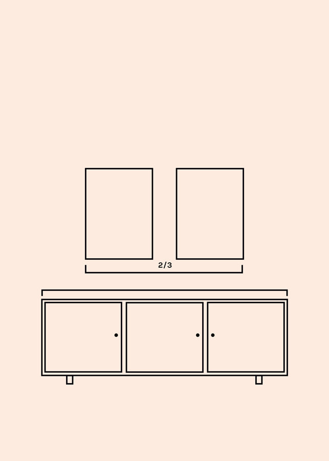 Si vas a colocar un cuadro o varios encima de un mueble, sofá o como cabecero de cama, este o estos deberían medir al menos dos tercios del mueble o elemento que se encuentra debajo de él. Dicho de otra forma, a simple vista no debería sobrepasar el largo del mueble o sofá.