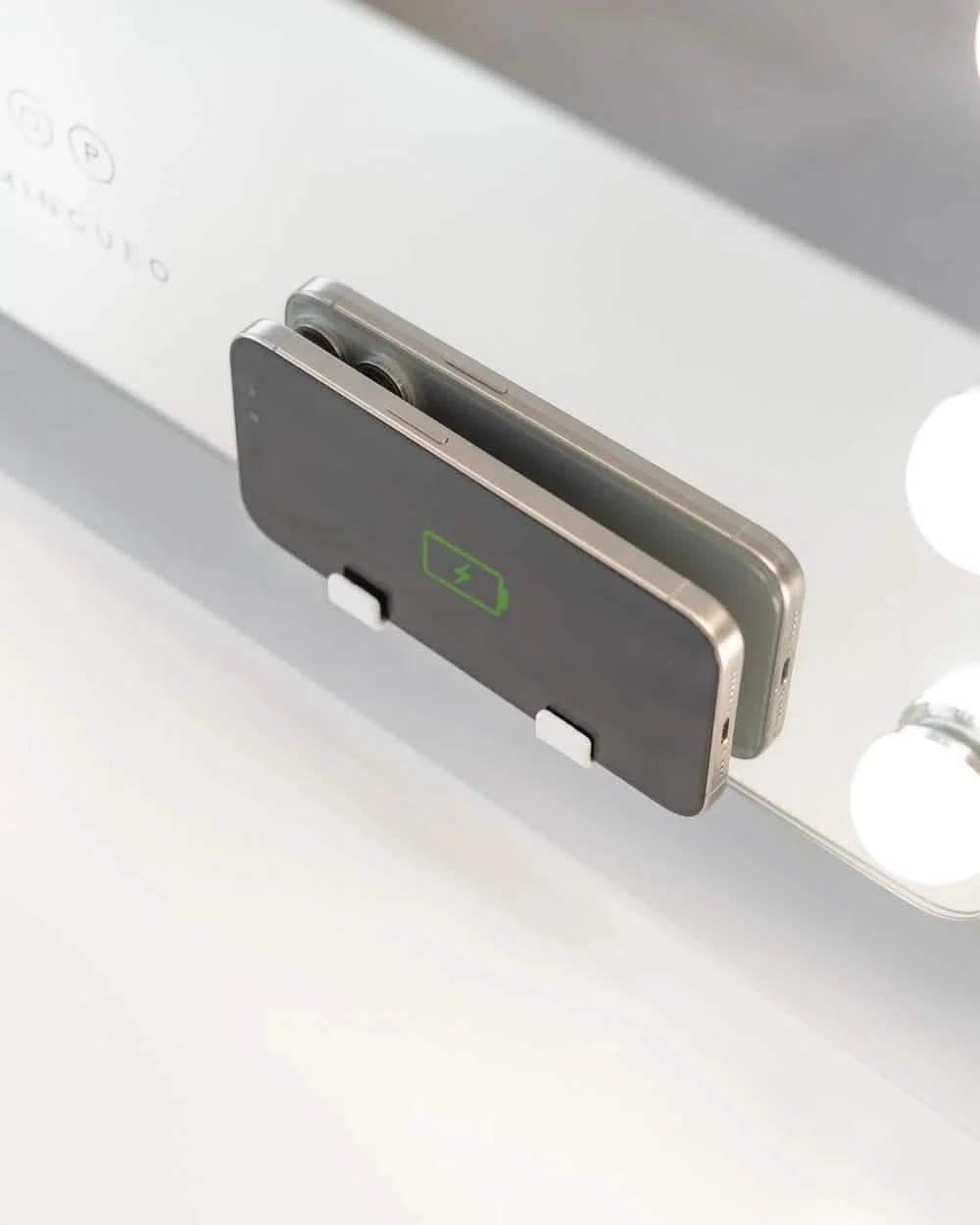 Espejo blanco reclinable con 15 luces LED, perfecto para maquillarte o disfrutar de tus rutinas de cuidado personal.