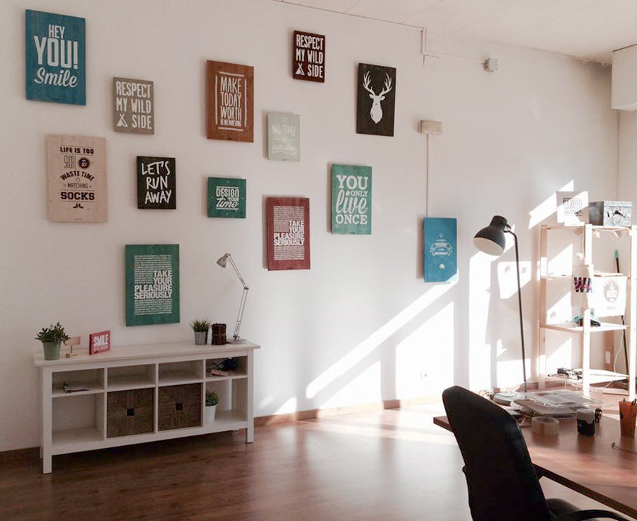 Holz passt zu jeder Art von Dekoration. Fügen Sie Ihren Wänden personalisierte Bilder hinzu und machen Sie Ihr Geschäft einzigartig.