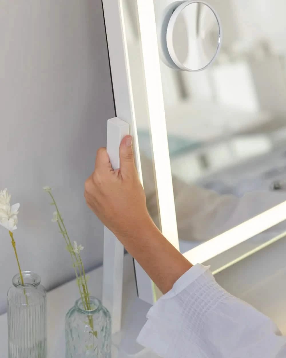Espejo blanco inclinable con tira de luces LED, ideal para maquillarte o dedicarte un momento de cuidado personal.